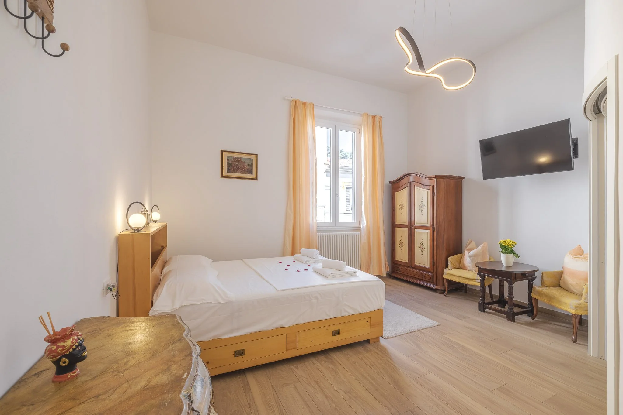 The apartment can host up to 4 people and it is equipped with two french double beds, a TV with Netflix, and a full equipped kitchen. Bed sheets, towels and soap are included. Continental breakfast is included and it will be served between 8 and 10 am .